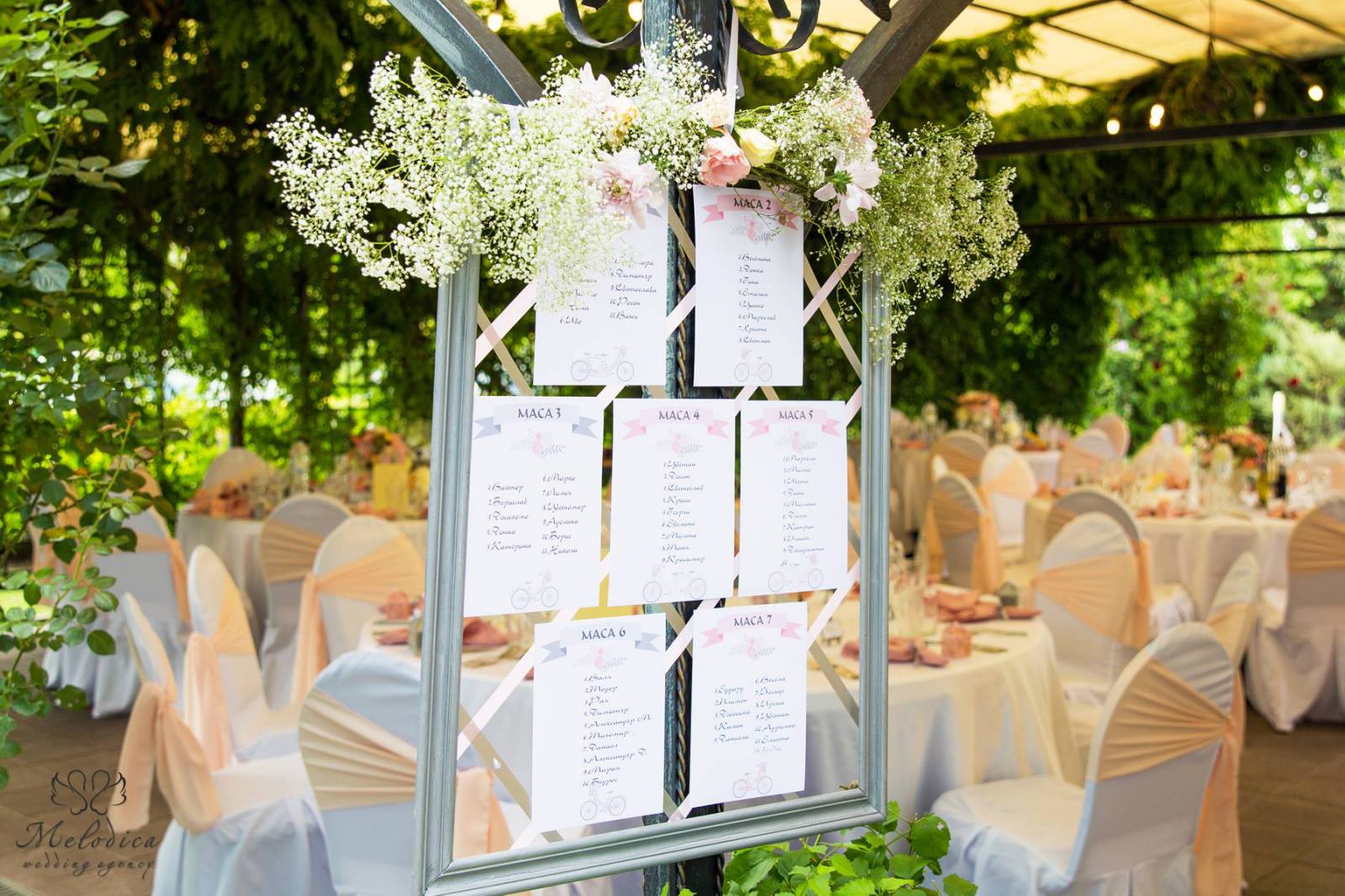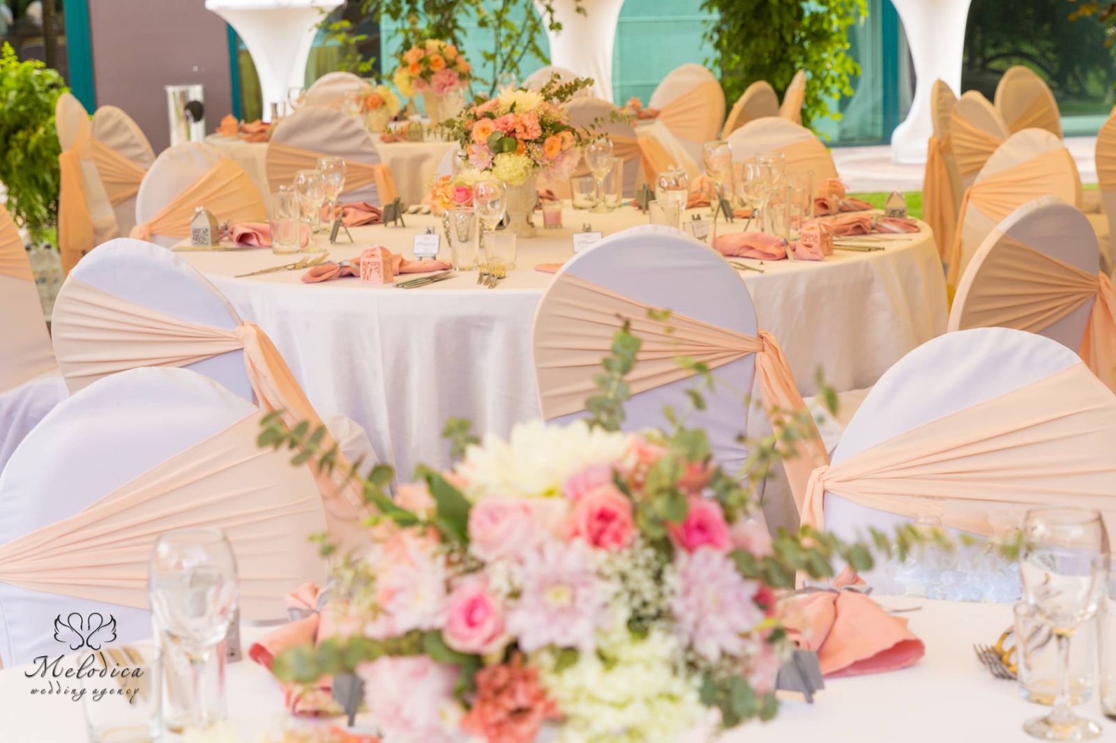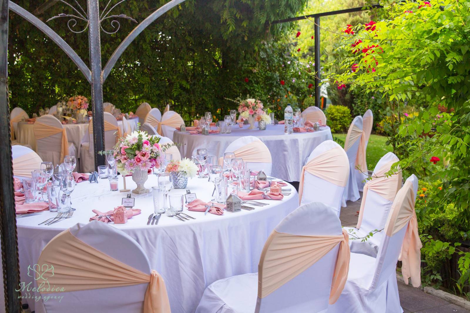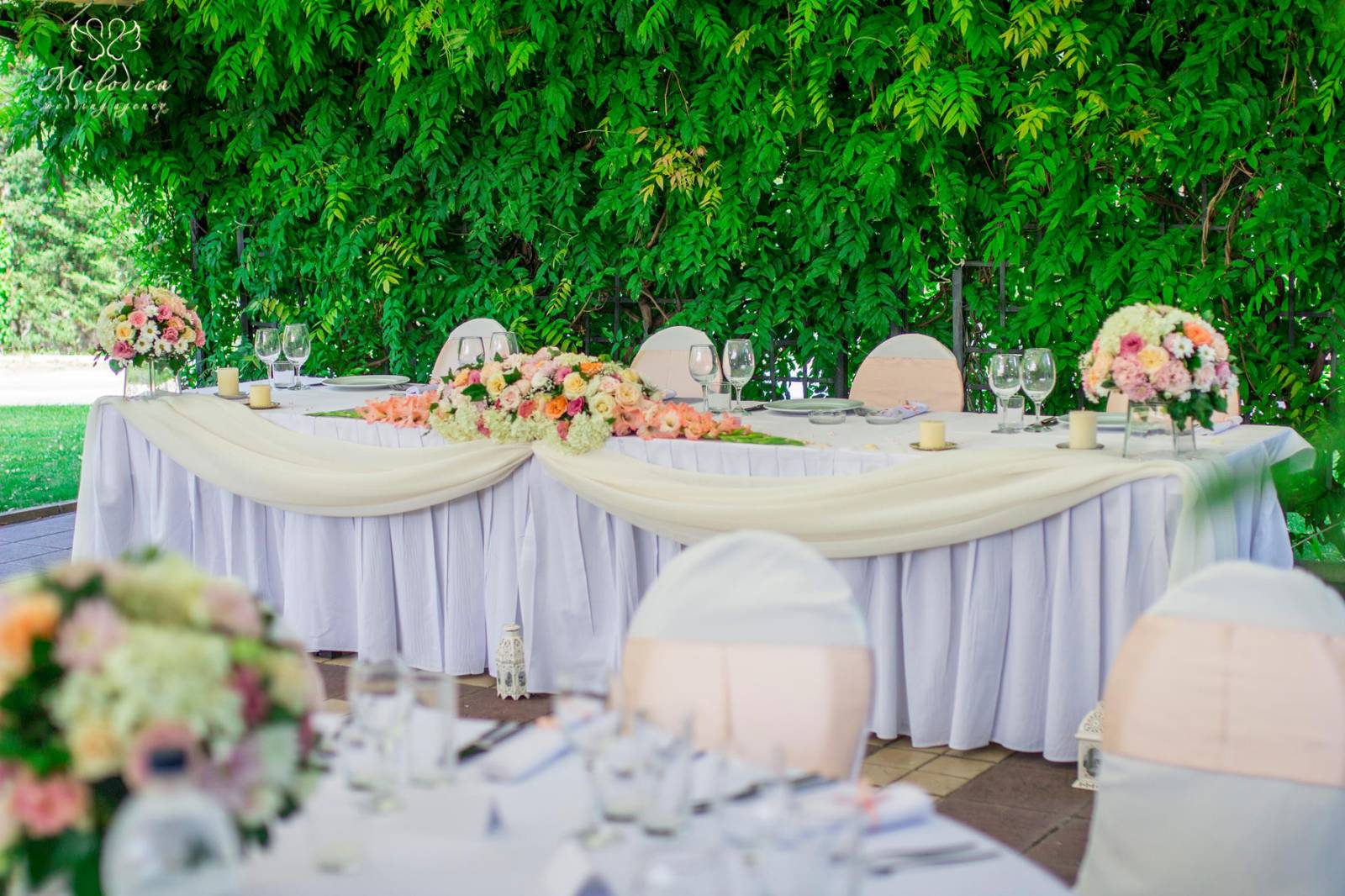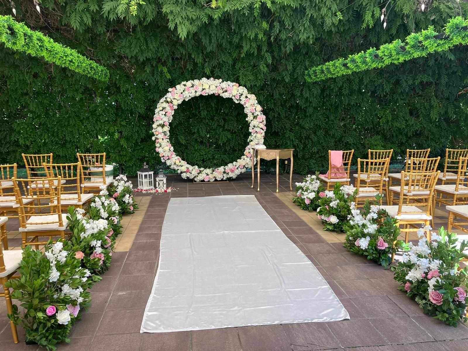 зелено и ярките нюанси на изобилието от цветя посреща младоженците и техните